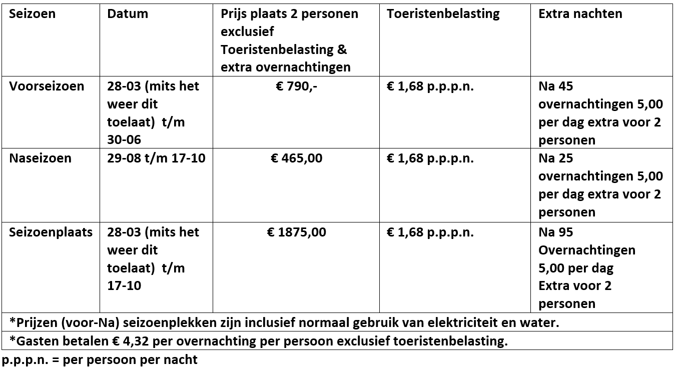 Genoemde prijzen zijn voor 2 personen all-in met uw eigen caravan, camper of tent groter dan 6m2 maar exclusief toeristenbelasting.